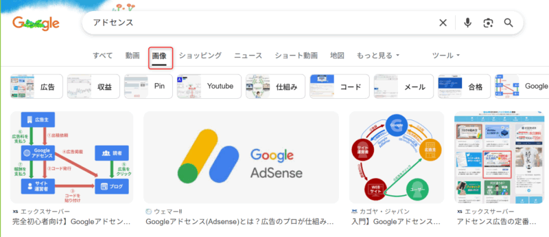 オリジナルの図解や写真は検索窓の「画像検索」で表示されます。基本上位の記事の画像が表示されるんですが、たまにH2~H3以下の見出し内の画像も拾われるので一定の評価があります。