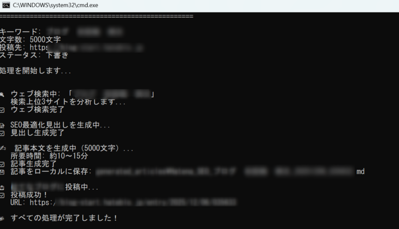 出てきた文章をコピペする作業があるので100%自動化ではないですが、この方が安全です。プログラミング分かる方はこの状態でワードプレスの下書きまでやろう!!って思うと思いますが(笑)