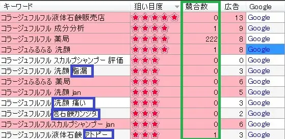 で、基本は見出しチェックツールに2語で狙いたいキーワードを入れたら以下のようなものを意識してください。